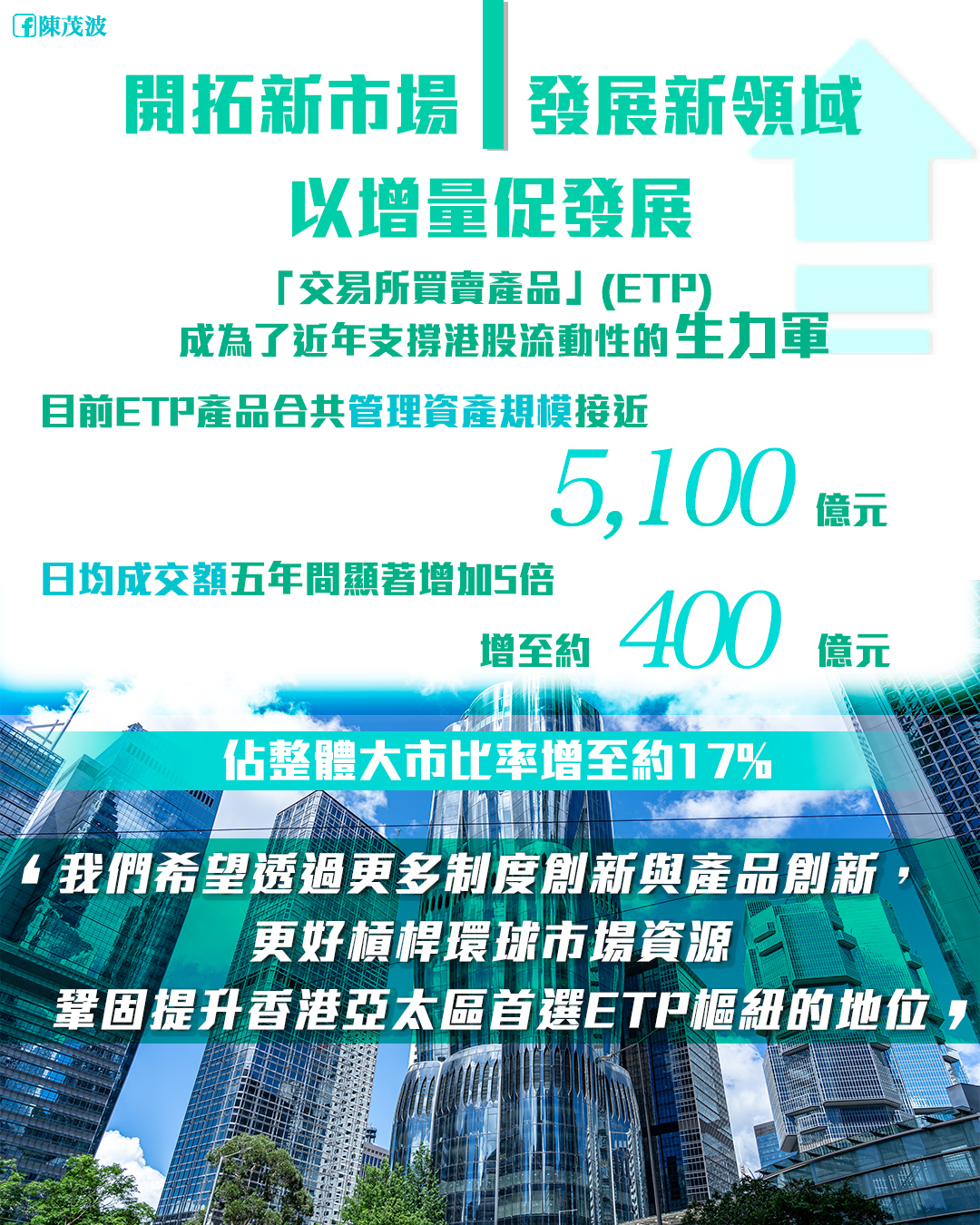 值得指出的是,即使過去幾年投資氣氛反覆,但本港ETP市場增長勢頭持續,相關成交額佔整體大市比率,由五年前的不足5%,增至今年首五個月的約17%。可以說,本港ETP市場的不斷創新帶來了增量,也滿足了持續變化的投資需求,為大市注入了活力和更大流動性,有效地在市場波動之際發揮了流動性緩衝(liquidity buffer)的作用。