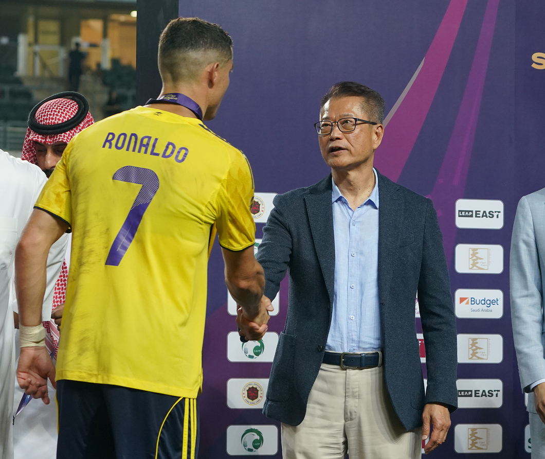 | 昨晚在香港大球場觀賞沙特超級盃決賽,並主持頒獎禮。 |