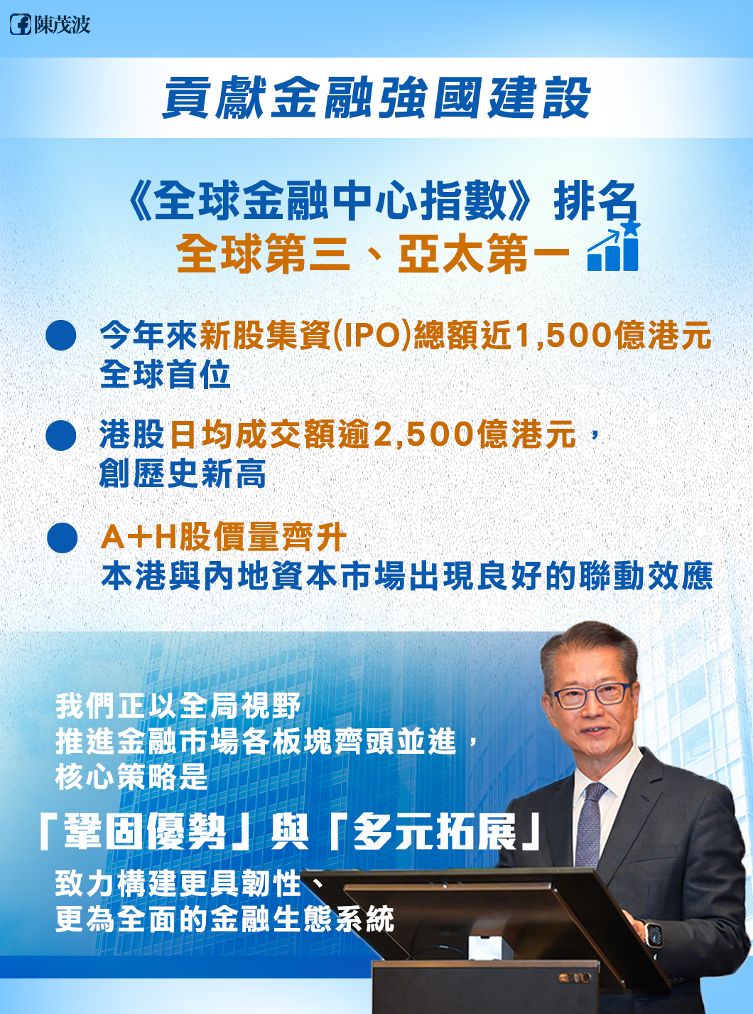 事實上,今年以來本港金融市場表現亮眼。例如,新股集資(IPO)總額至今接近1,500億港元,全球排首位,而且國際長線資金參與度明顯增加。港股氣氛暢旺,恒生指數今年來累計上升超過30%;交投創歷史新高,每日平均成交額超過2,500億港元。今年首八個月,上市公司的再融資額更為IPO集資額的接近3倍,反映香港市場的深度與活躍度。