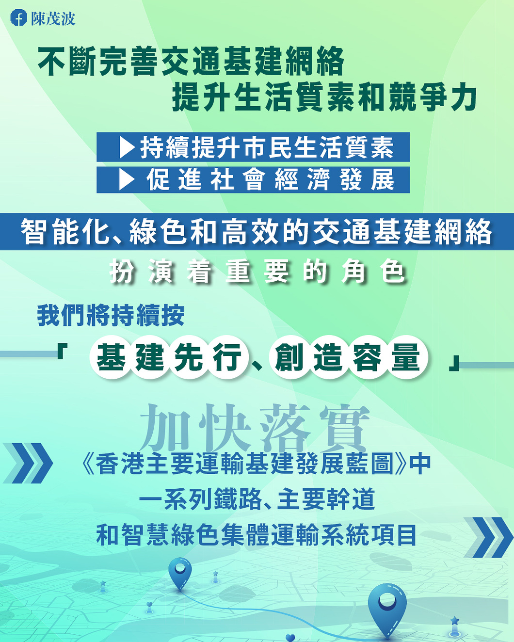 我們將繼續按「基建先行、創造容量」的方針,加快落實《香港主要運輸基建發展藍圖》中提出的一系列鐵路、主要幹道和智慧綠色集體運輸系統項目。