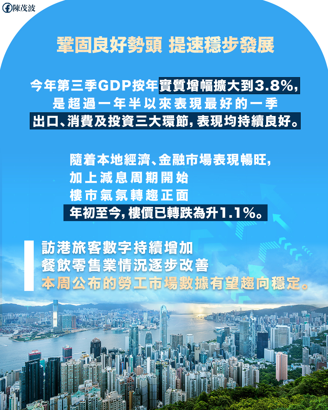 With this year included, Hong Kong’s economy will have achieved positive growth for three consecutive years. Looking ahead to next year, the Hong Kong economy is expected to continue expanding. International institutions generally forecast moderate global economic growth in 2026, with the Chinese Mainland and Asia as a whole being the key growth drivers. This, together with recent easing of trade tensions, will further support our export performance. Locally, consumption and business sentiment are improving, and both consumption and investment activities are expected to keep expanding. Although external uncertainties remain — such as the pace of US interest rate cuts and possible shifts in global trade policy — we will remain vigilant of risks while also seizing emerging strategic opportunities.