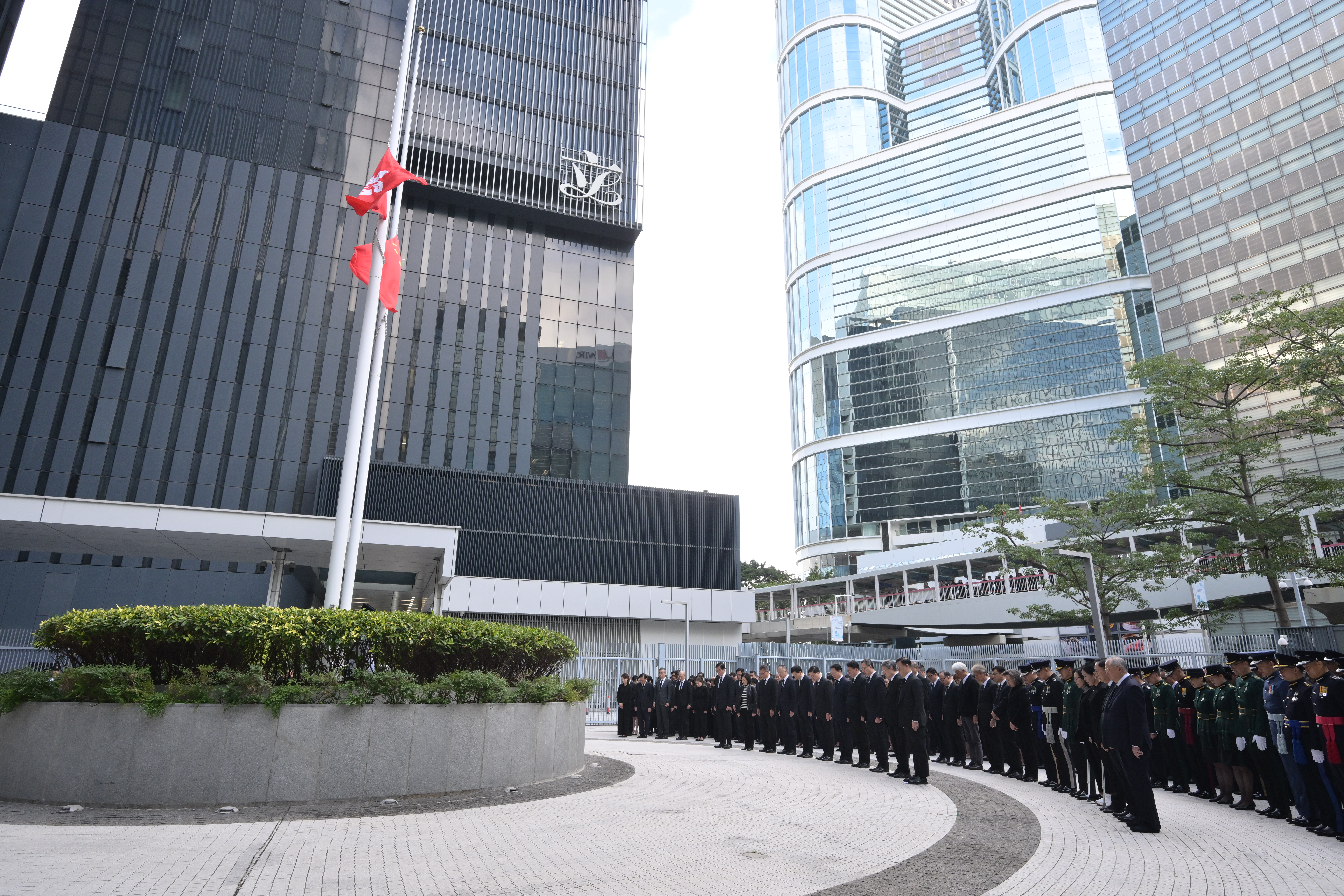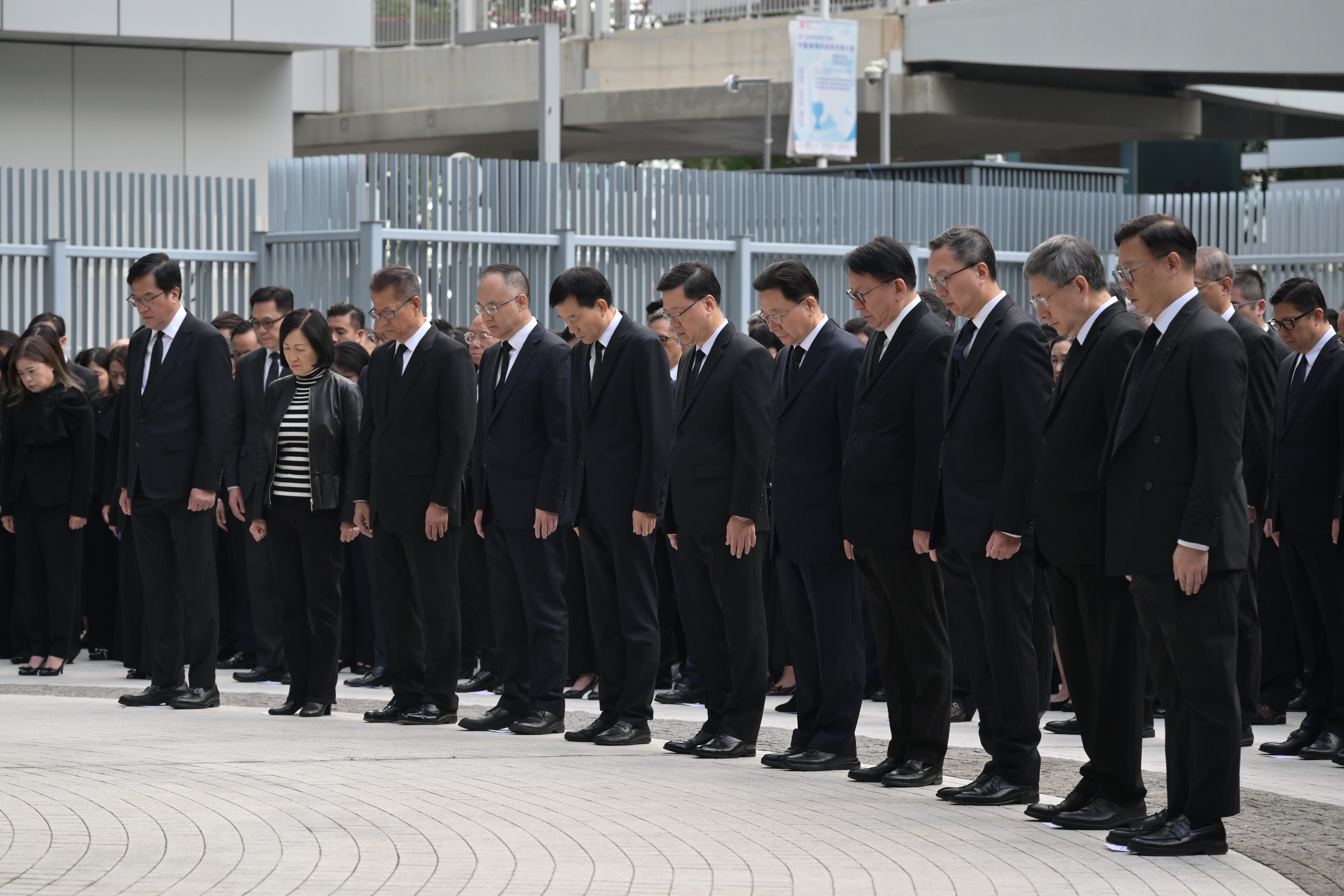 | The Chief Executive, together with principal officials, Non-Official members of the Executive Council and civil servants, observed a three-minute silence yesterday morning at the CGO to solemnly mourn those who lost their lives in the tragic fire at Wang Fuk Court in Tai Po, and flags at all government buildings were flown at half-mast. |